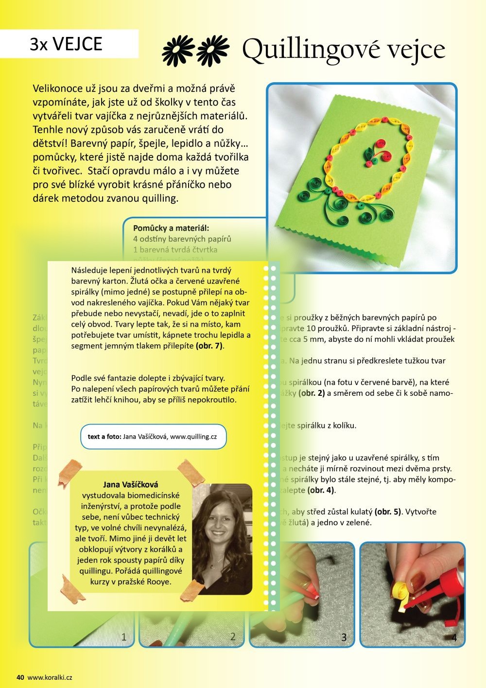 Pro ty z vás, které technika zaujala, jsem pro časopis Korálki přichystala jednoduchý návod na „quillingové vajíčko“. Časopis si můžete v těchto dnech zakoupit na všech pobočkách obchůdku Rooya, ale i vybraných novinových stáncích (a že jich není málo).