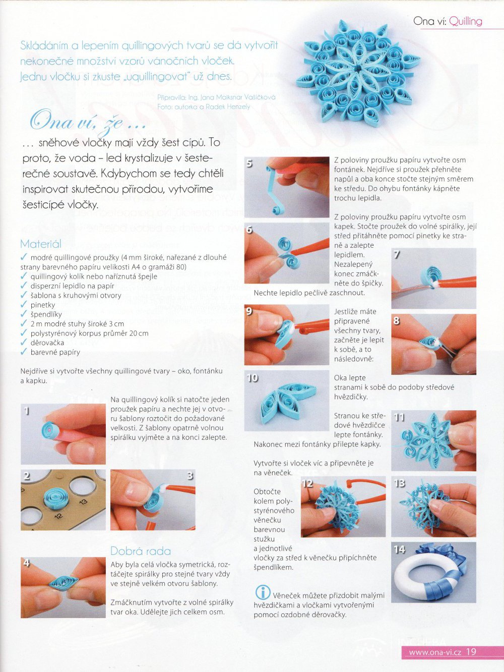 Další z quillingových návodů, který jsem vytvořila pro časopis Ona ví. Tentokrát se naučíte věneček s vločkami vytvořenými technikou quilling. A jako bonus přidávám návod na krásný šperk. Tvorbě šperků jsem se věnovala přes deset let, tak snad Vás i tento návod potěší.