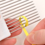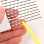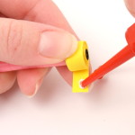 Křidélko kuřátka je vytvořené pomocí quillingového hřebínku. Na jedno křidélko stačí asi polovina žlutého proužku (4). Na konci proužku vytvoříme přes první zub hřebínku smyčku a zalepíme jí (smyčkou lze po zubu volně pohybovat). Vedeme proužek přes čtvrtý zub zepředu dozadu, až se vrátíme zespodu zpět k prvnímu zubu (kde je prvotní smyčka), sem kápneme trochu lepidla.