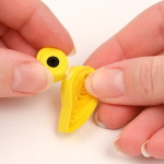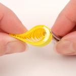 Tělíčko kuřátka je z quillingového tvaru, který se nazývá kapka. Spojíme si konci tři žluté proužky (7) a natočíme je na quillingový kolík. Vzniklou spirálku sundáme z kolíku, vložíme do otvoru kružnicové šablony (velikosti cca 2 cm), kde se volně rozvine. Nyní koneček spirálky přilepíme. Pomocí pinetky přitáhneme střed spirálky ke straně a spoj potřeme lepidlem (až zprůhlední, můžeme pinetku sundat). Na jedné straně tvar zmáčkneme do špičky (ocásek kuřátka). Hlavičku a tělíčko přilepíme k sobě.
