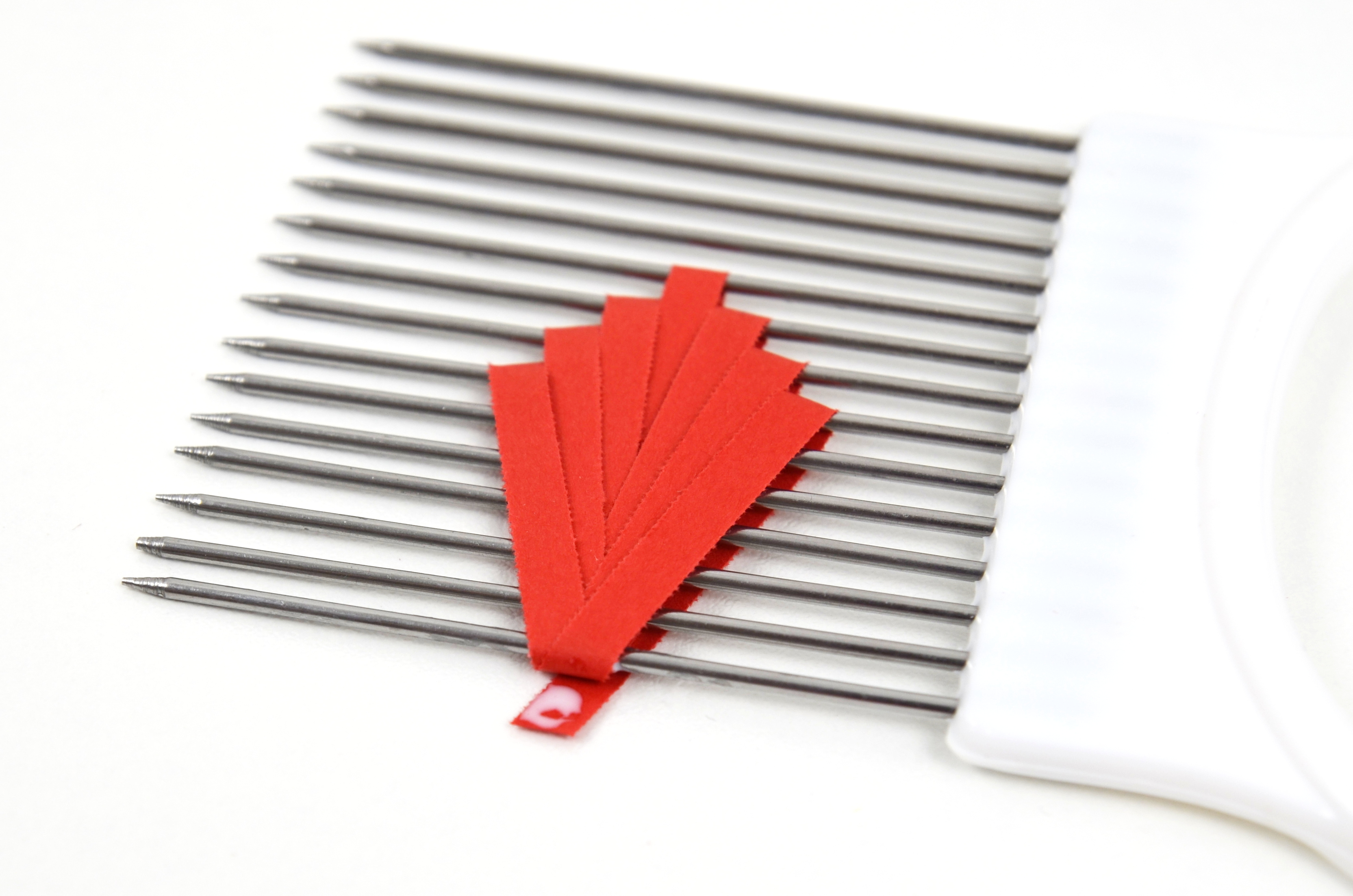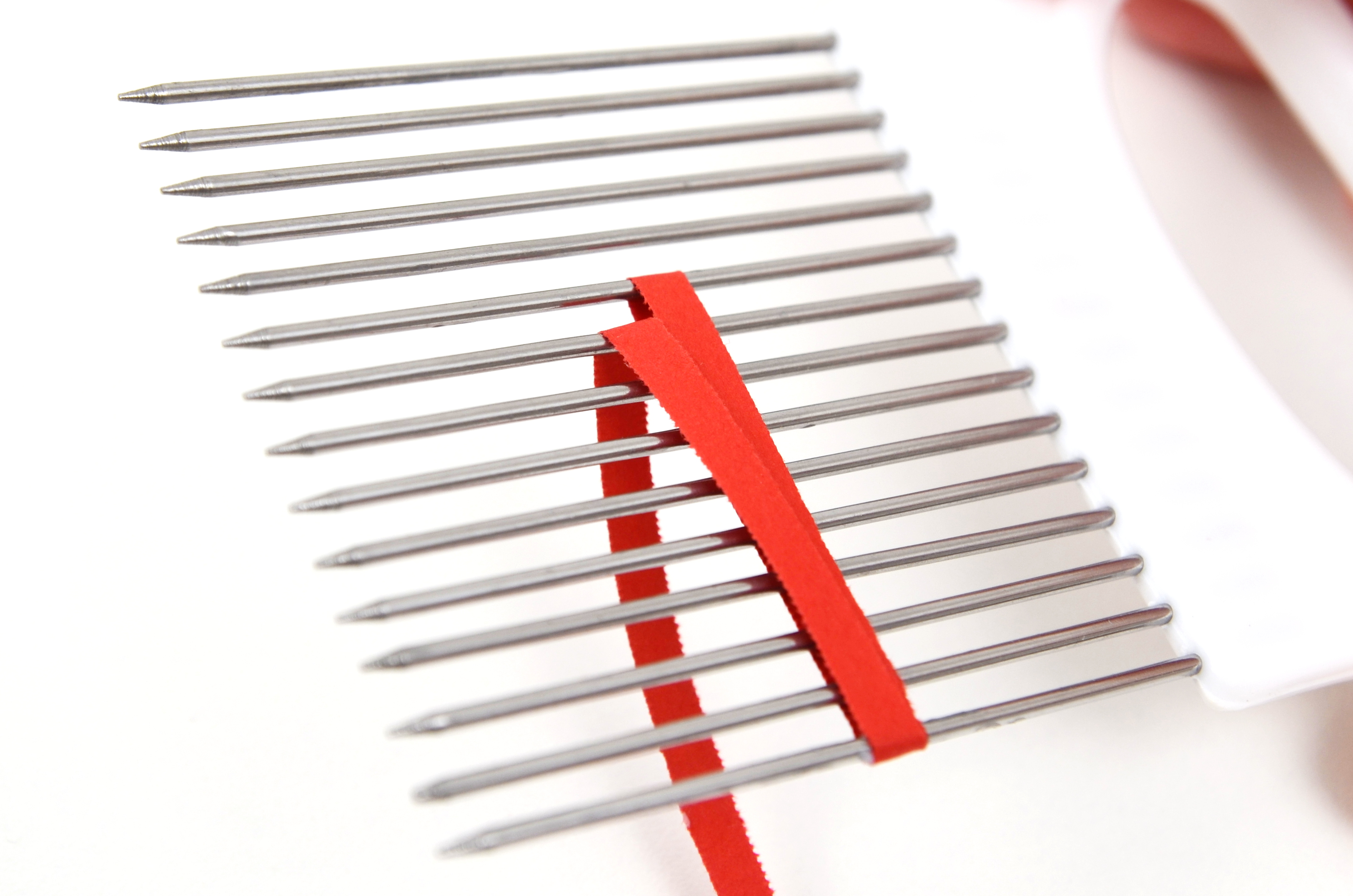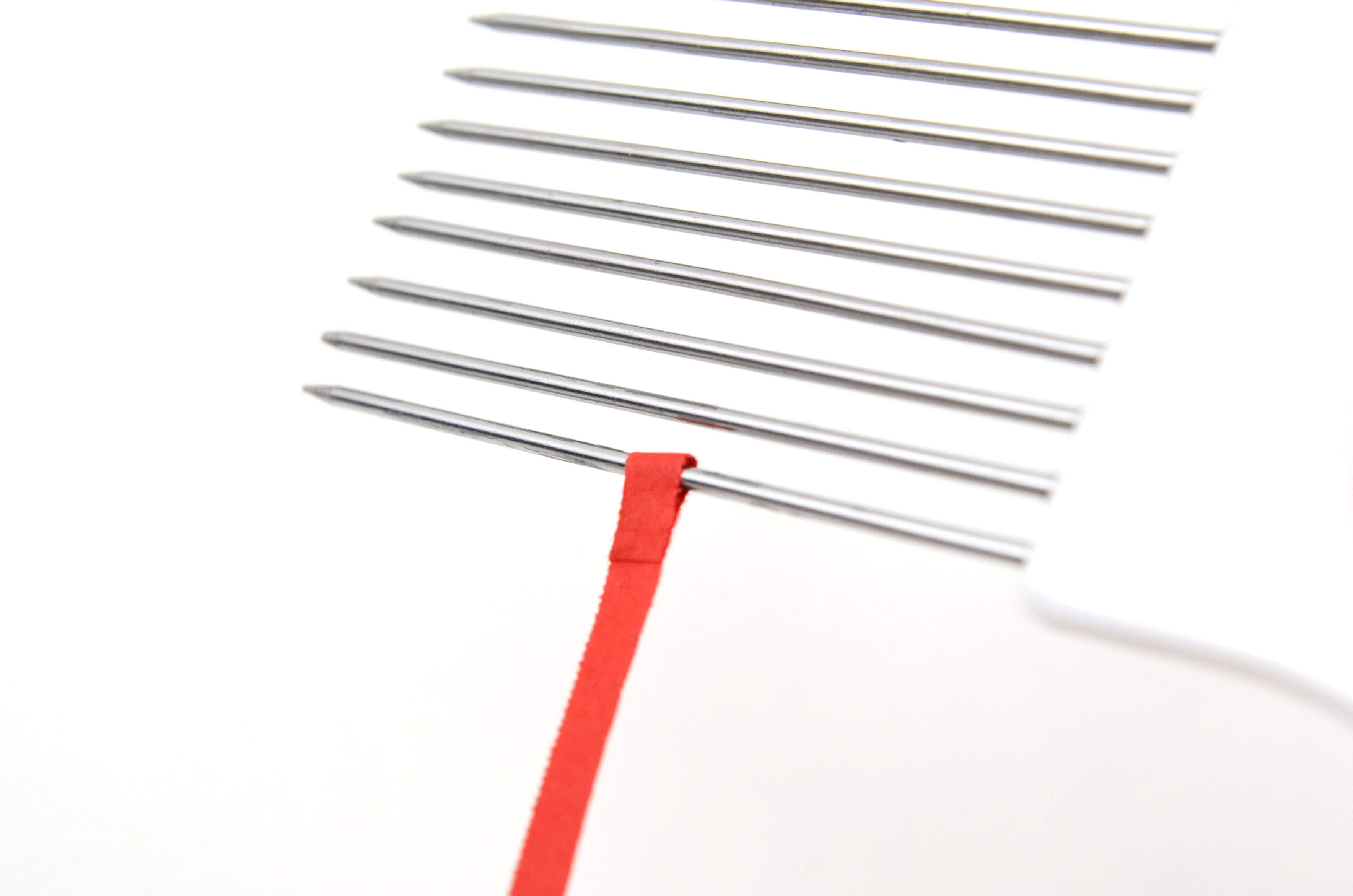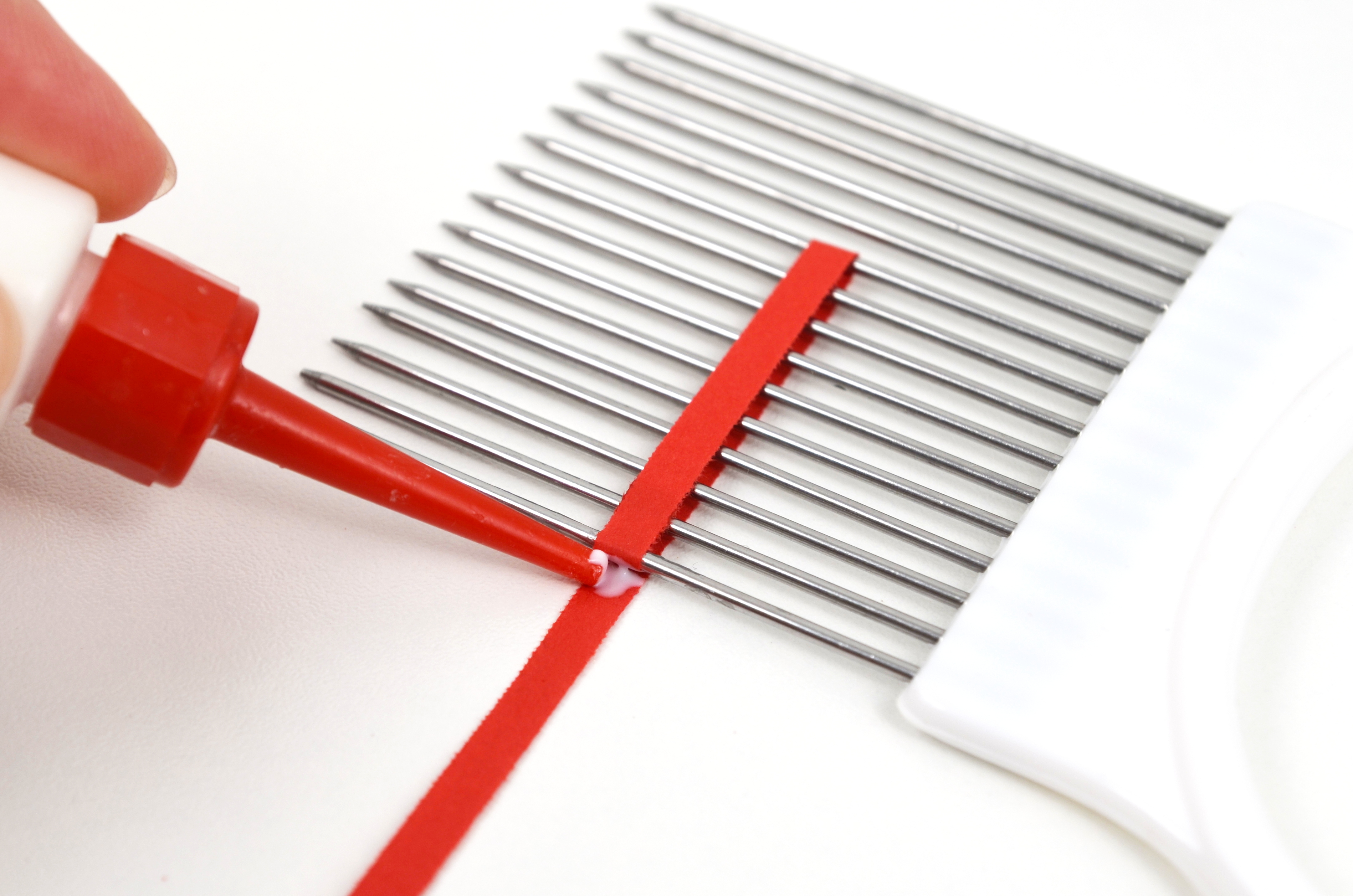 • Na proužku papíru udělejte smyčku a tu navlékněte na první zub hřebínku.