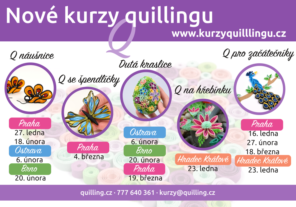 Vytvořila jsem jednoduchý přehled všech quillingových kurzů, které se budou konat od ledna do března. Velkým hitem je teď kurz na quillingové šperky, ten pražský lednový byl hned obsazený, tak jsem přidala termín i v únoru. Hodně oblíbené (a rychle plné) jsou před Velikonocemi kurzy na dutou kraslici. Těším se na setkání s těmi, které již znám i novými kurzistkami 🙂