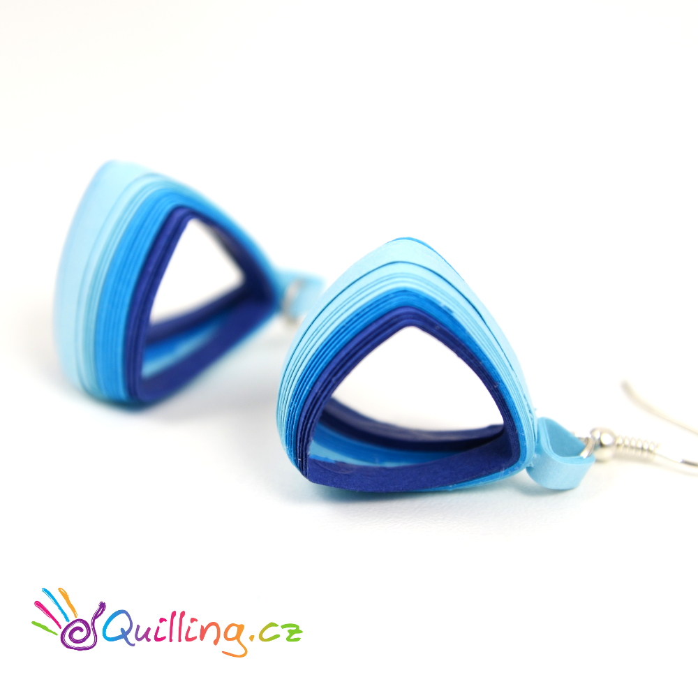 Spojte v jeden dlouhý proužek tyto tři proužky: světle modrý, modrý a tmavě modrý. Udělejte to ještě jednou, ať jsou barevné proužky dva, protože jedna náušnice je spojená ze dvou dílů. Obmotejte jeden spojovaný barevný proužek kolem pátého patra quillingové trojúhelníkové věže.