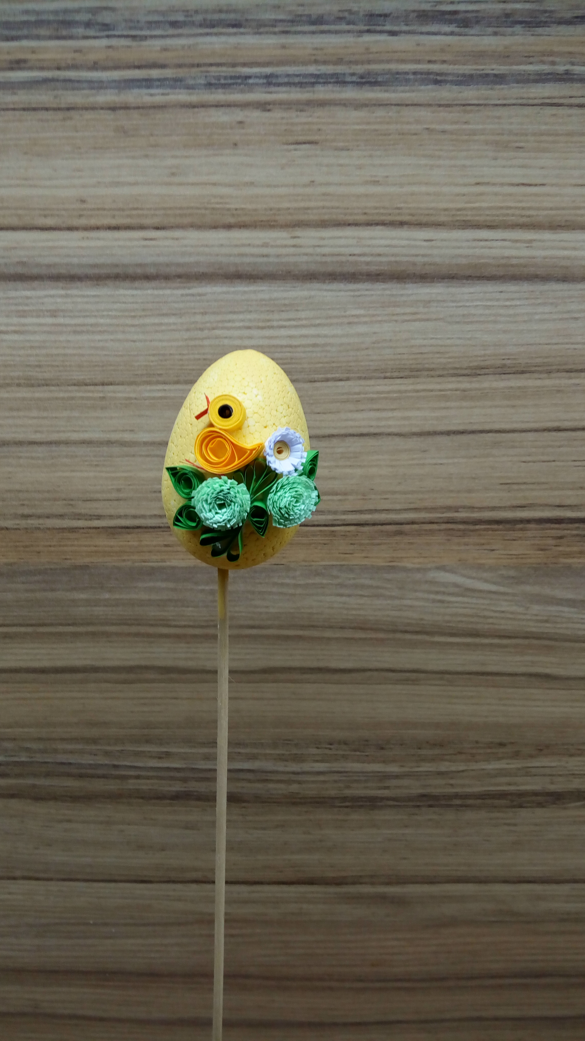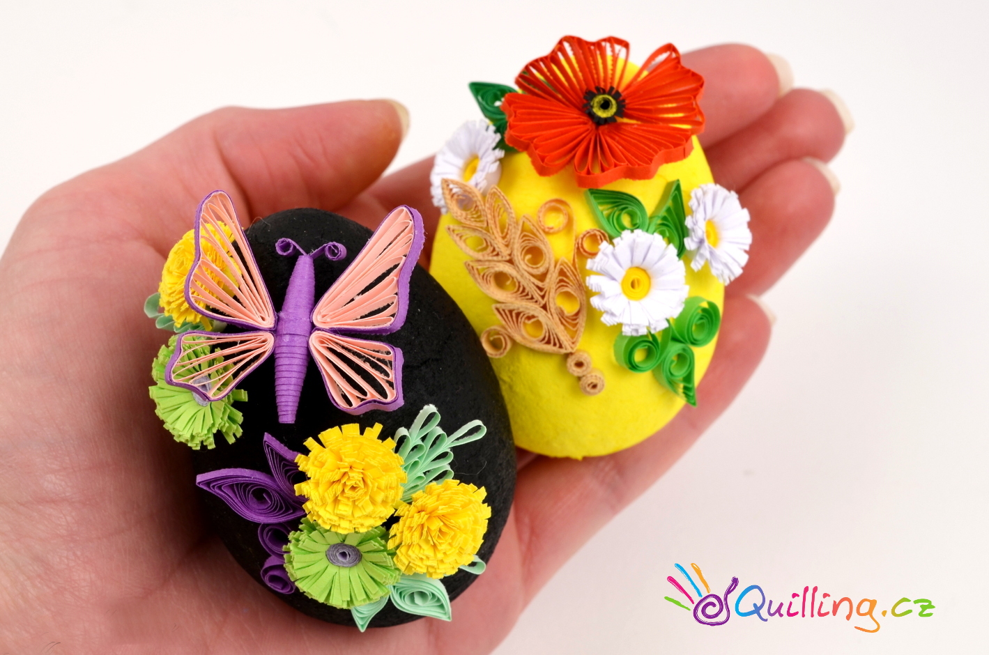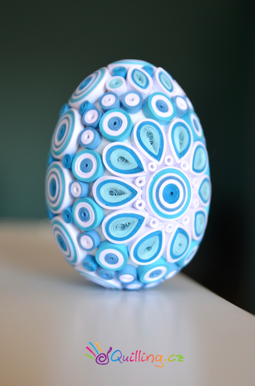 Velikonoční quillingová kraslice nemusí být jen dutá. Když použijete jako podklad poylystyrenové vajíčko, může to vypadat také velmi pěkně. Navíc je lepení na podklad jednodušší než formování vajíčka na plastové formě.