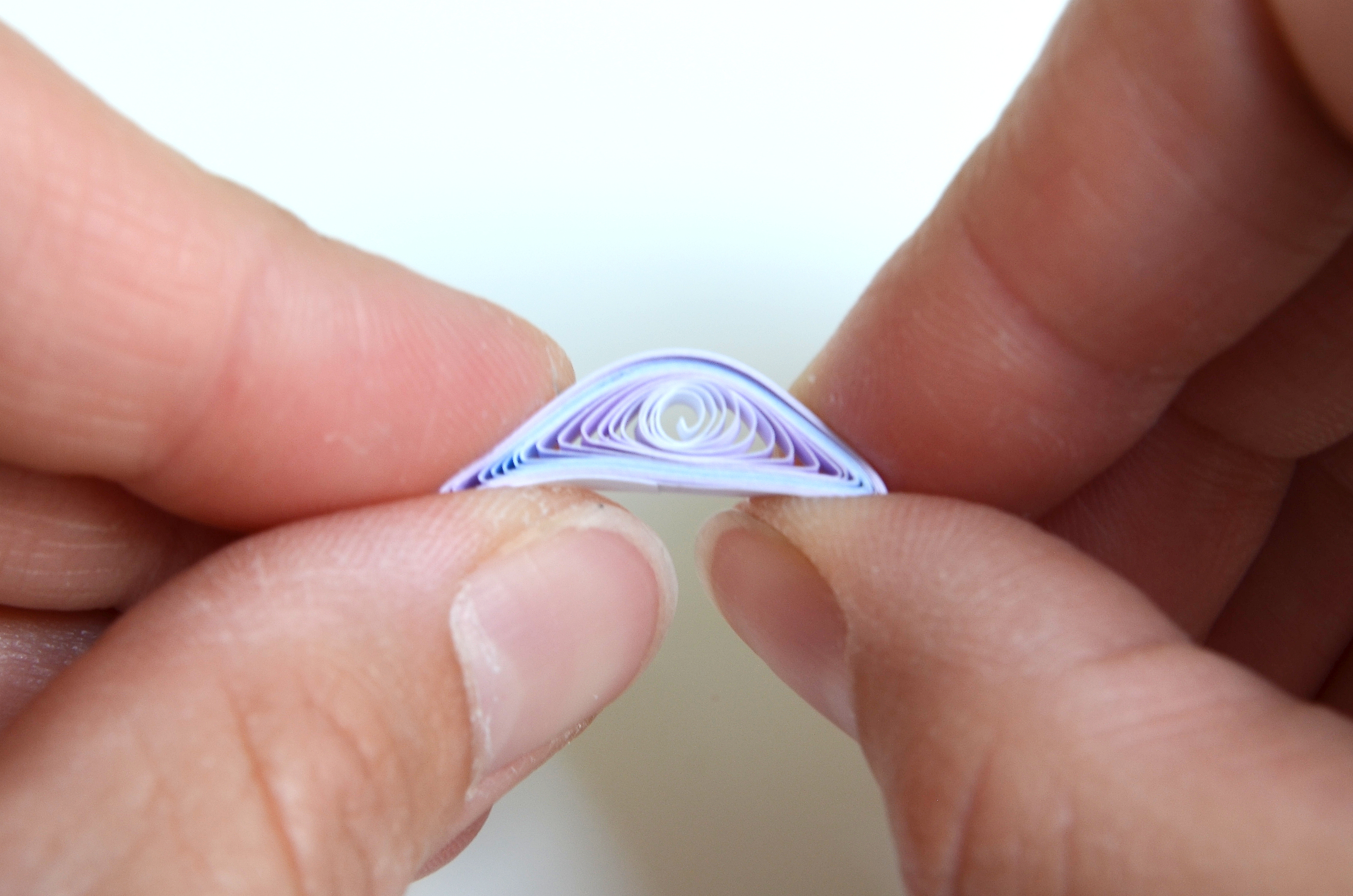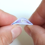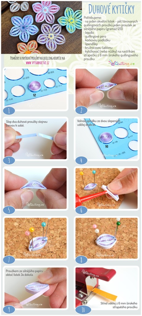 Vytvořte si z tónovaných quillingových proužků duhovou kytičku. Návod je na jeden okvětní lístek, celkem jich budete potřebovat pět. Do středu kytičky dejte stočený střapatý proužek.