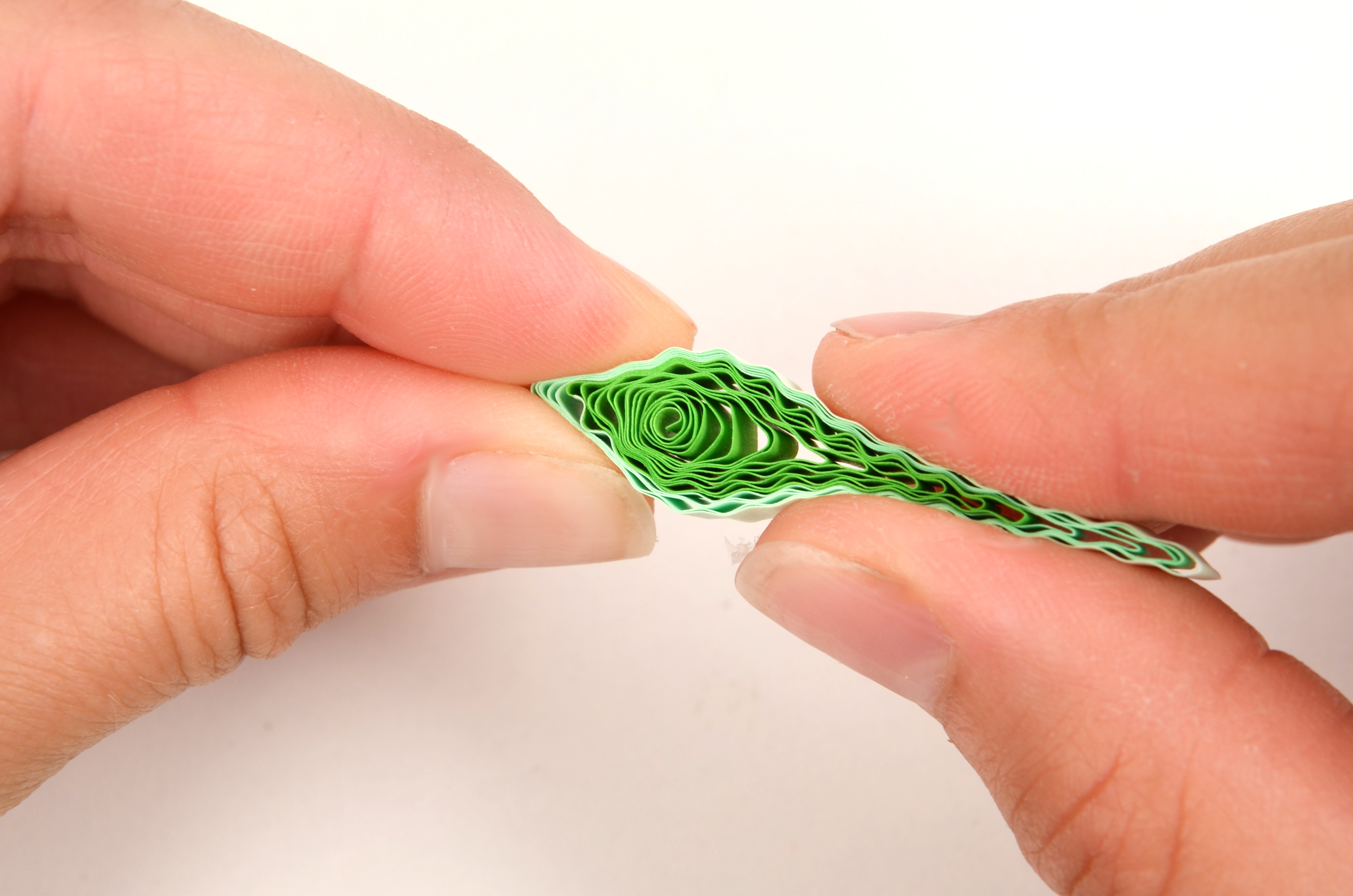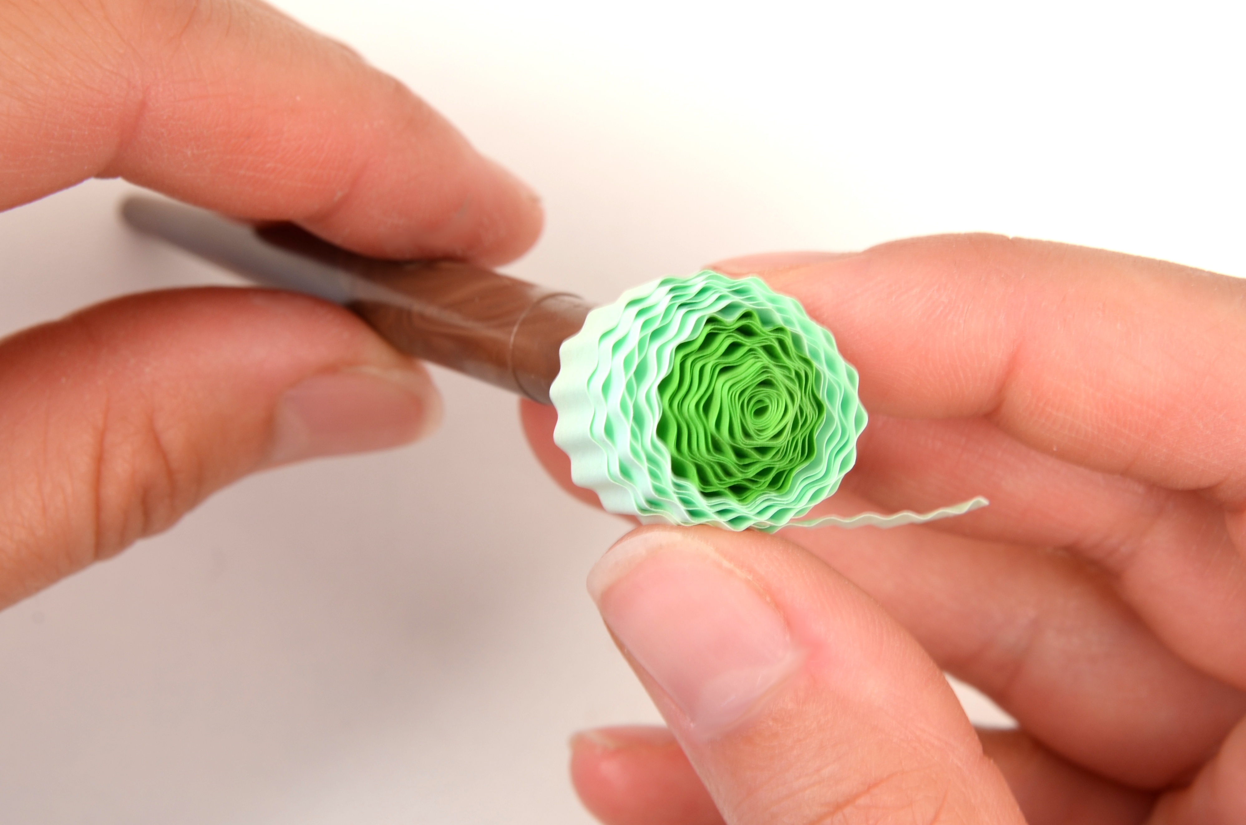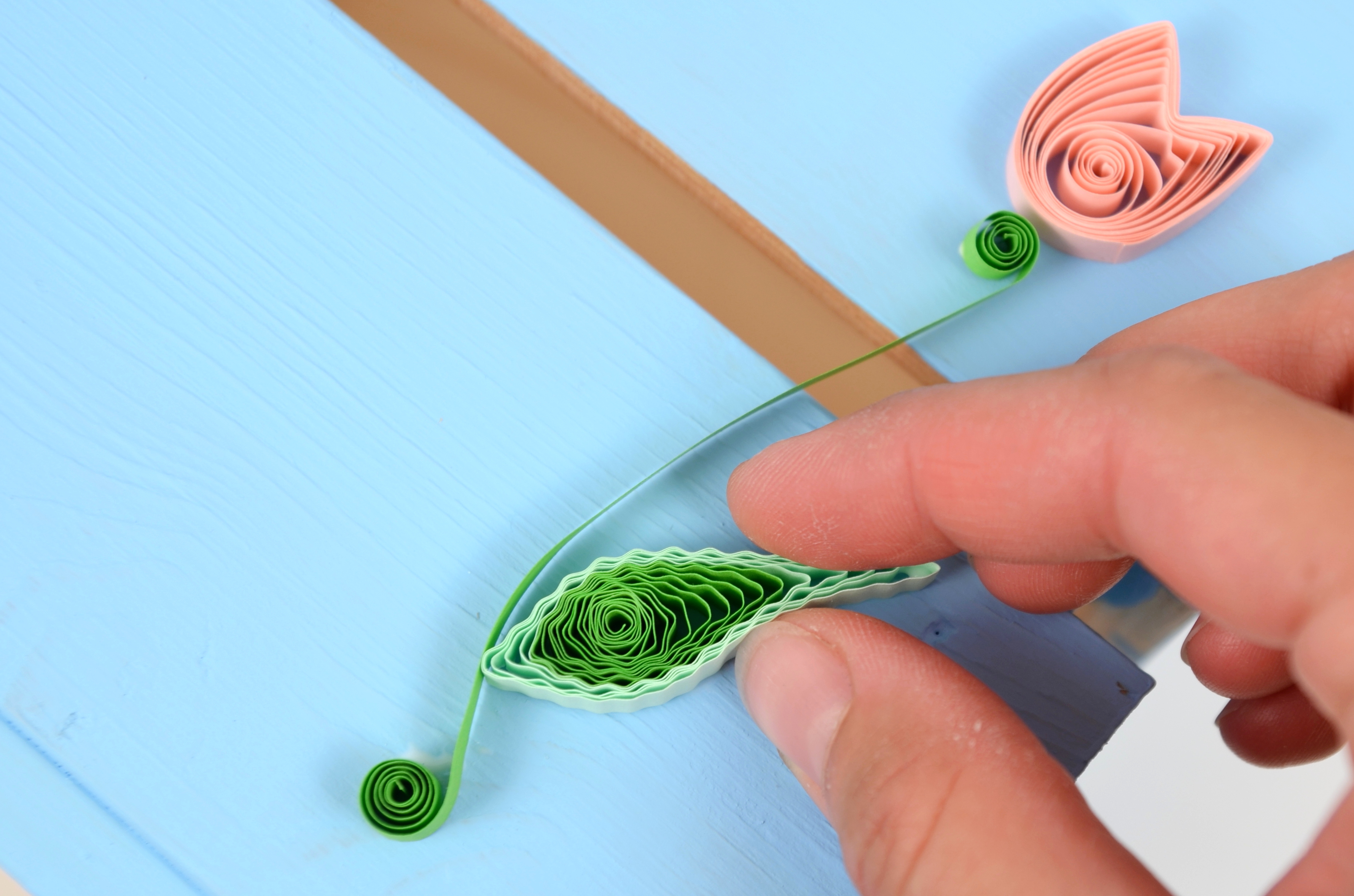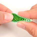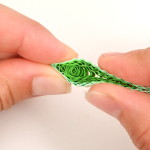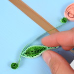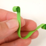 Na přípravu lístků budete potřebovat vlnkovačku. Nejdříve si však slepte k sobě jeden světle zelený a jeden trávově zelený proužek papíru. Pomocí vlnkovačky celý proužek navlňte. Stejně jako tulipánek naviňte vlnitý proužek na quillingové pero. Příliš neutahujte. Nechejte proužek rozmotat v kružnicové šabloně na quilling nebo v prstech do velikosti asi 2 cm. Koneček zalepte a začněte z něj formovat lístek. Přitáhněte si prsty střed ke straně a tam, kde není střed, zmáčkněte spirálku do špičky.