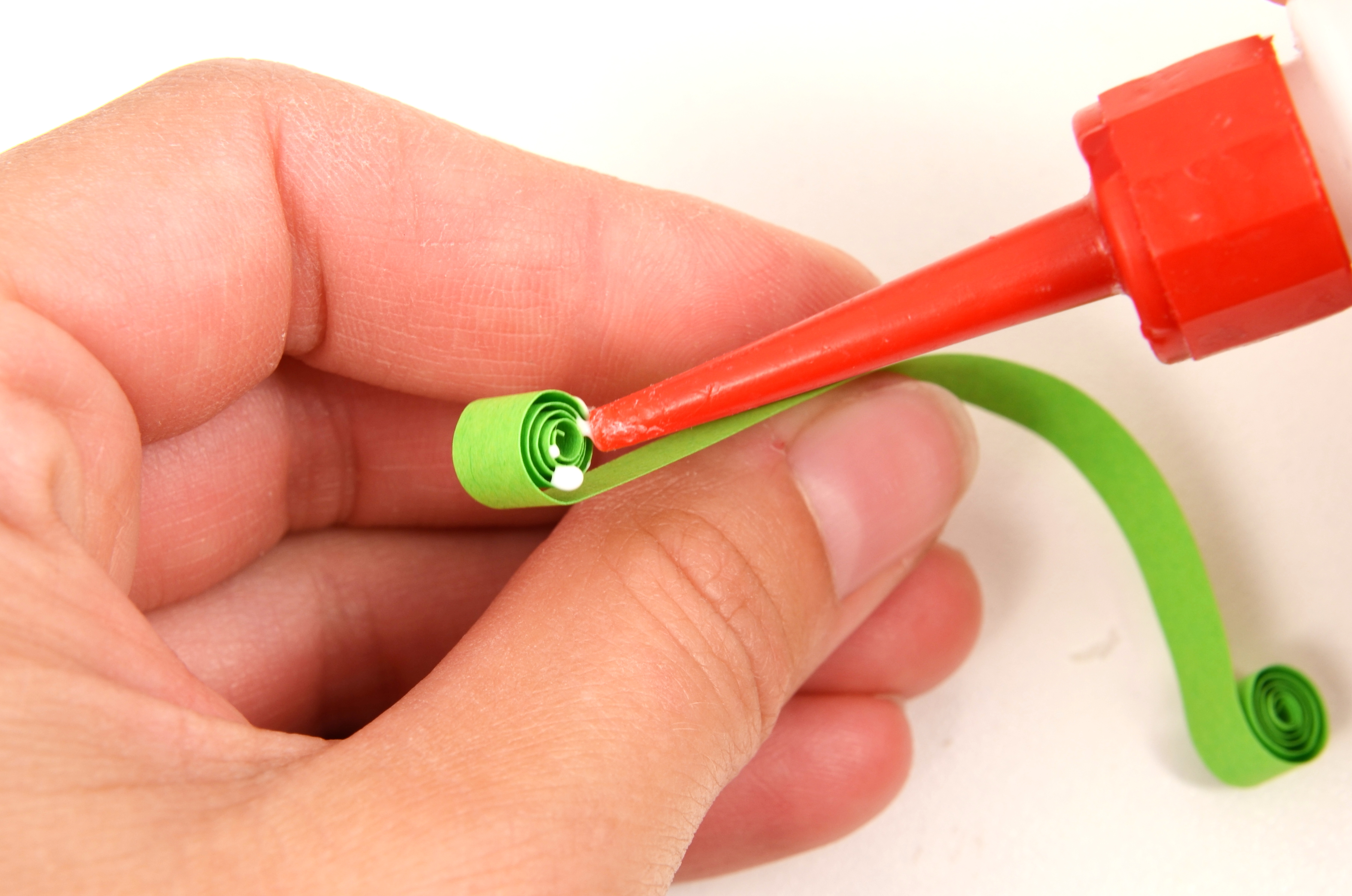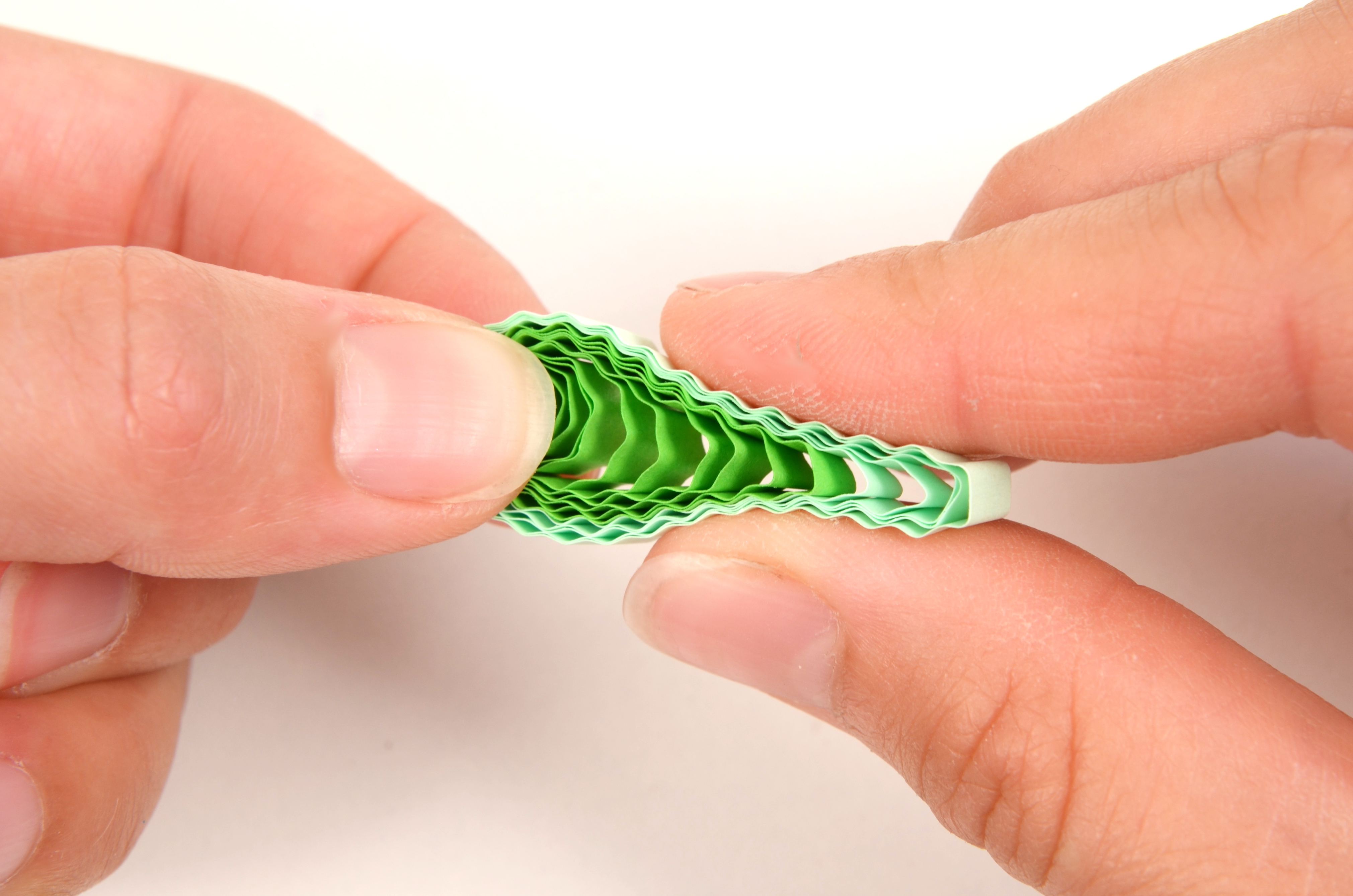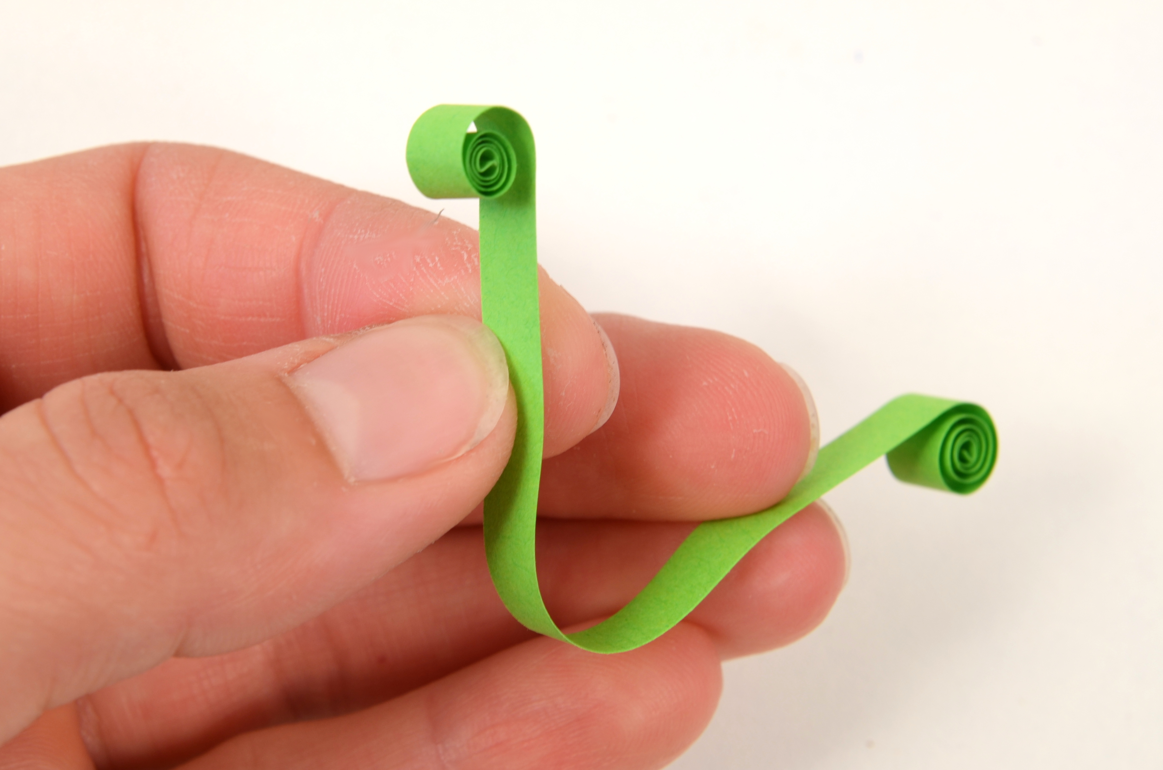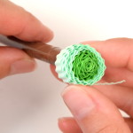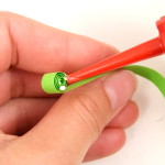 Na přípravu lístků budete potřebovat vlnkovačku. Nejdříve si však slepte k sobě jeden světle zelený a jeden trávově zelený proužek papíru. Pomocí vlnkovačky celý proužek navlňte. Stejně jako tulipánek naviňte vlnitý proužek na quillingové pero. Příliš neutahujte. Nechejte proužek rozmotat v kružnicové šabloně na quilling nebo v prstech do velikosti asi 2 cm. Koneček zalepte a začněte z něj formovat lístek. Přitáhněte si prsty střed ke straně a tam, kde není střed, zmáčkněte spirálku do špičky.