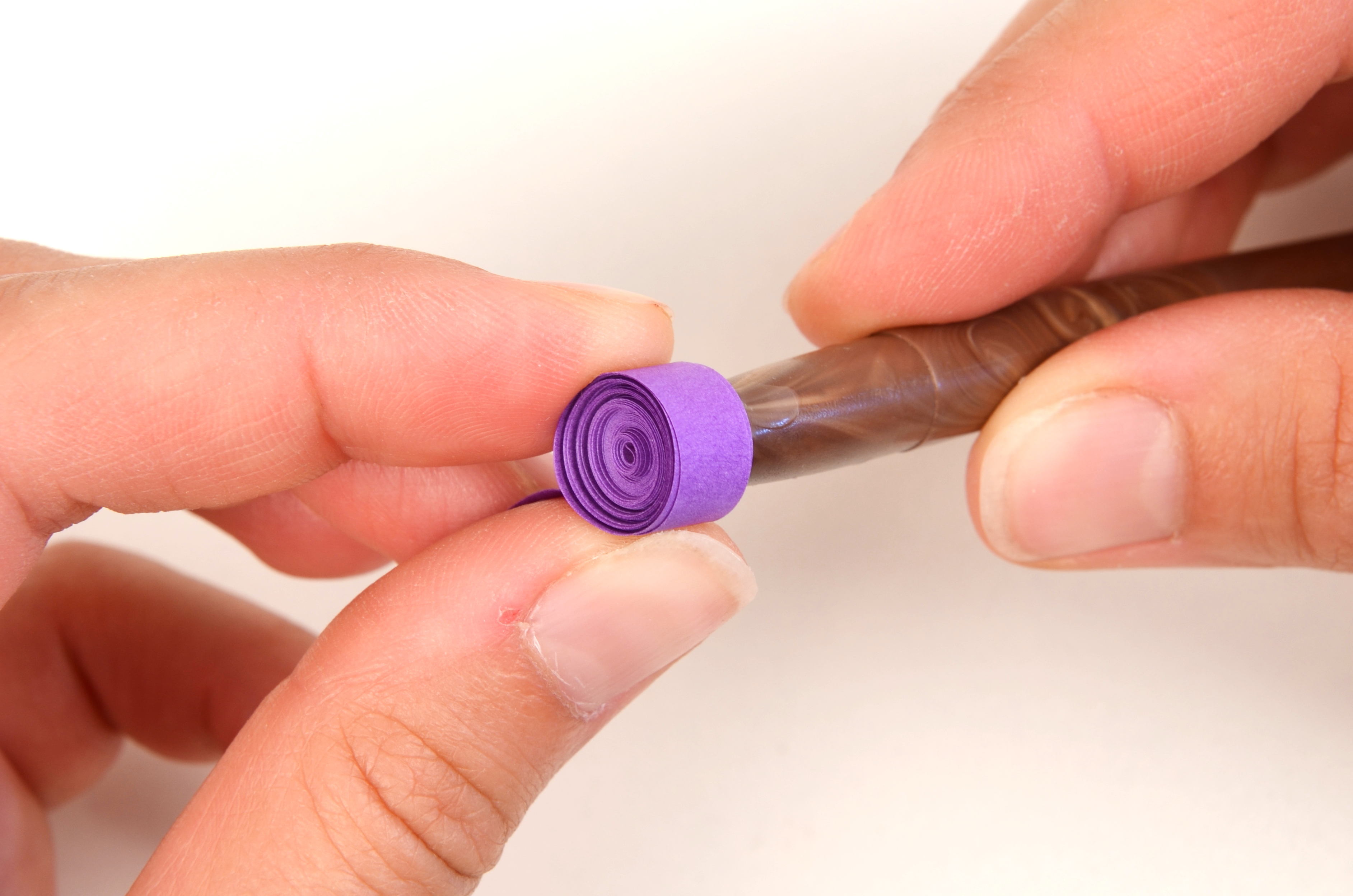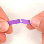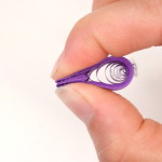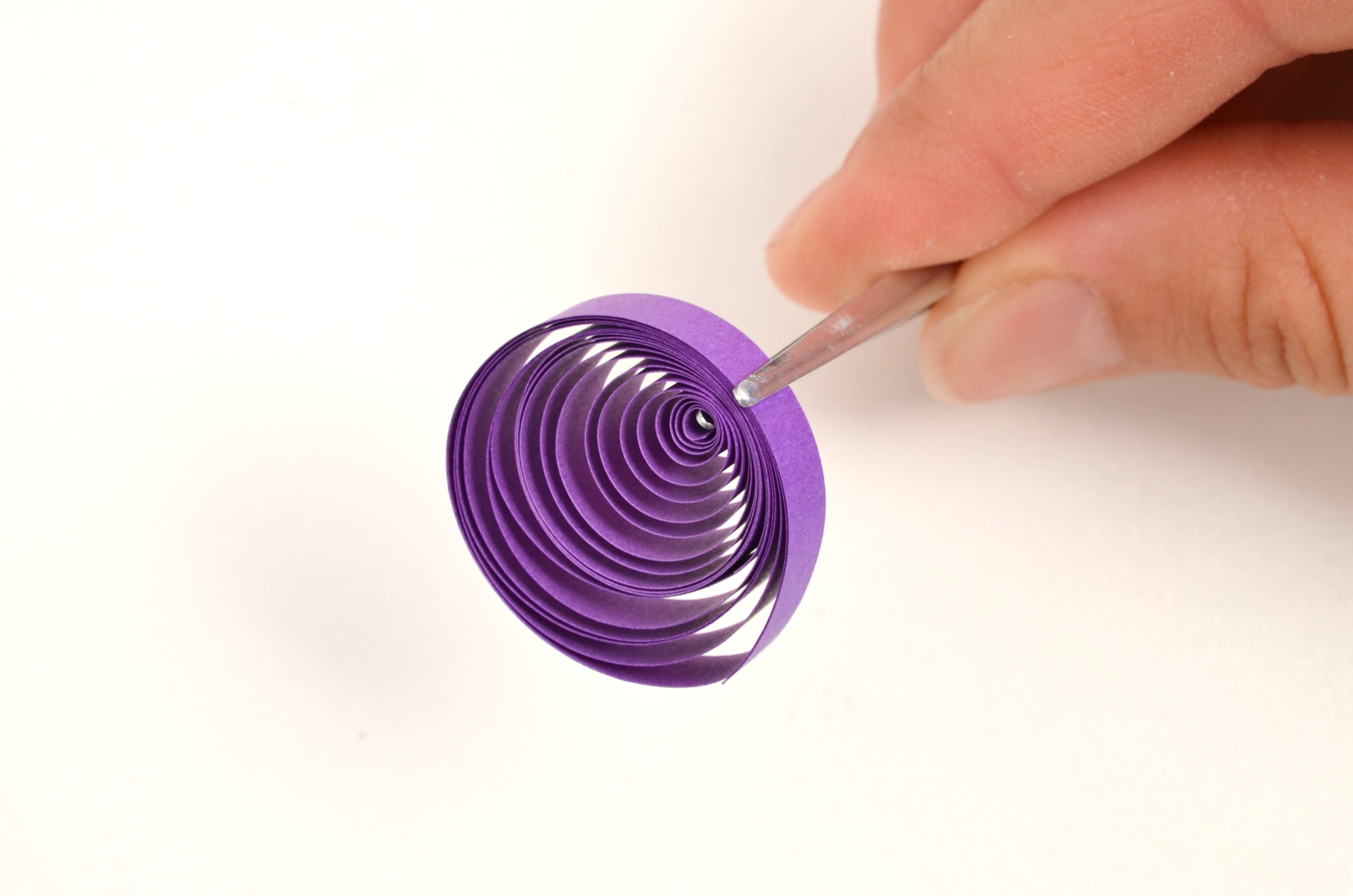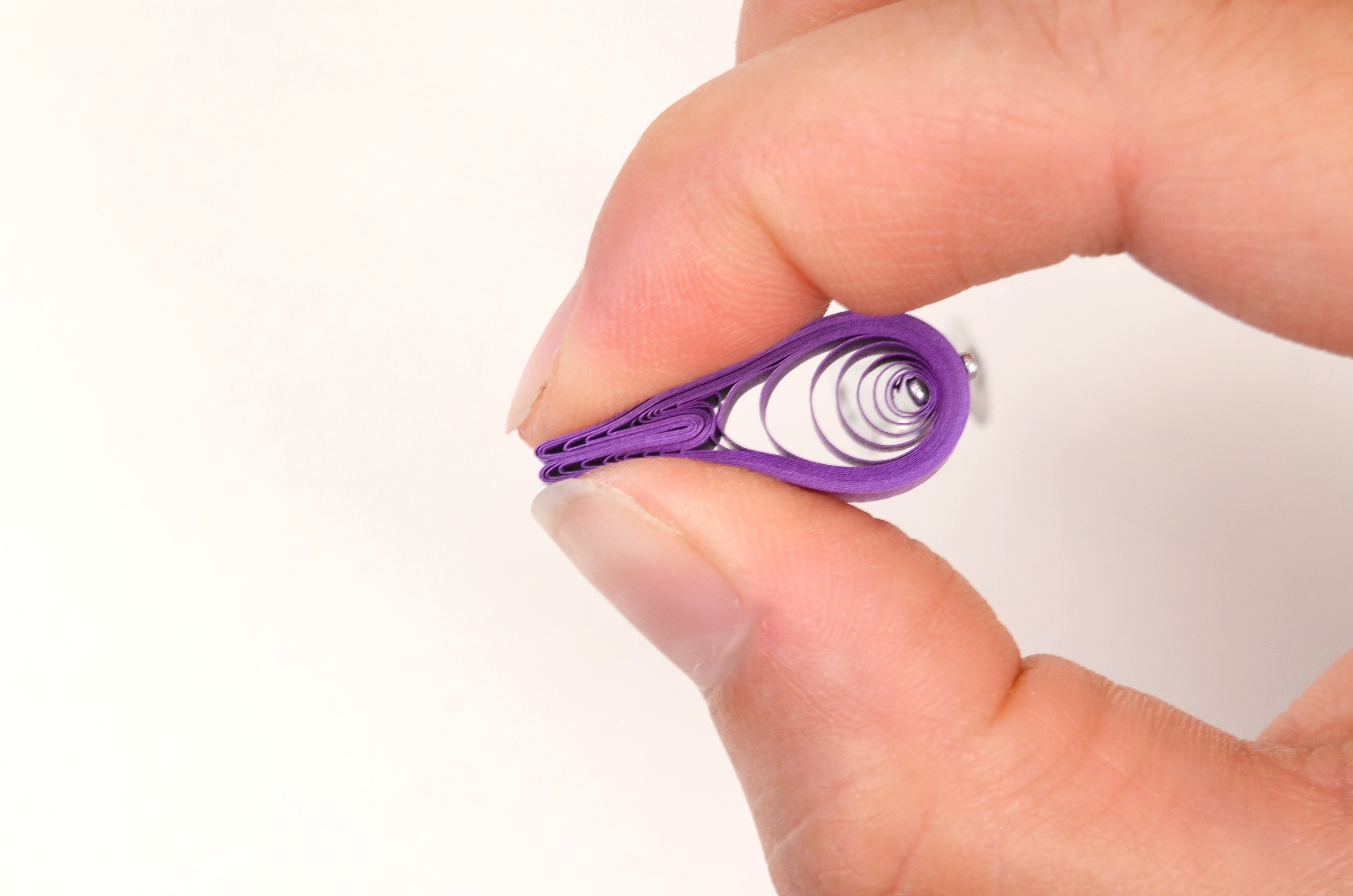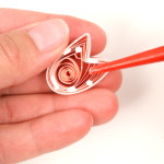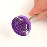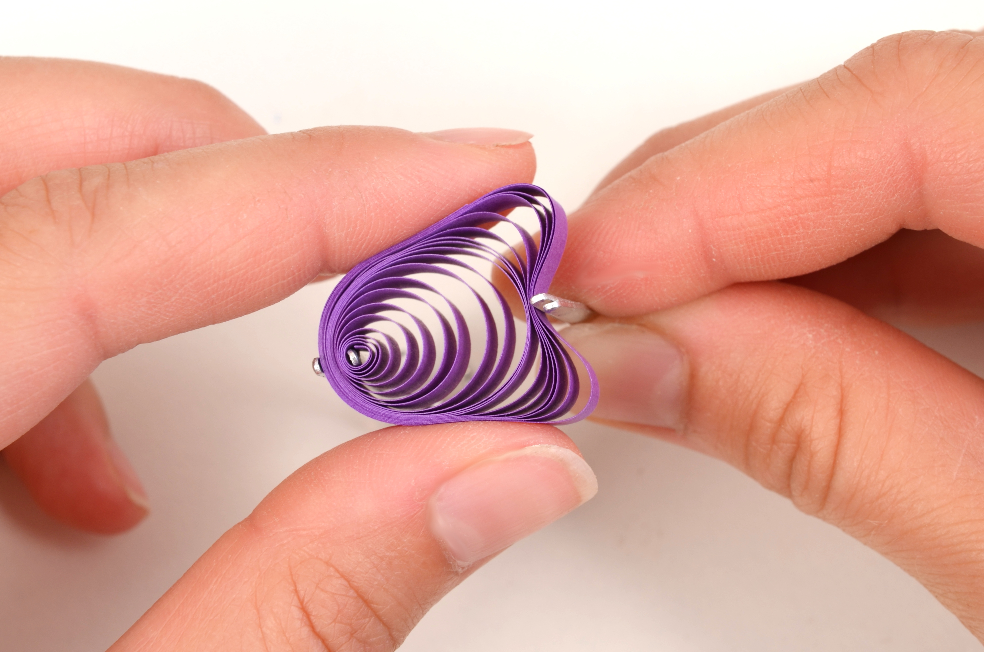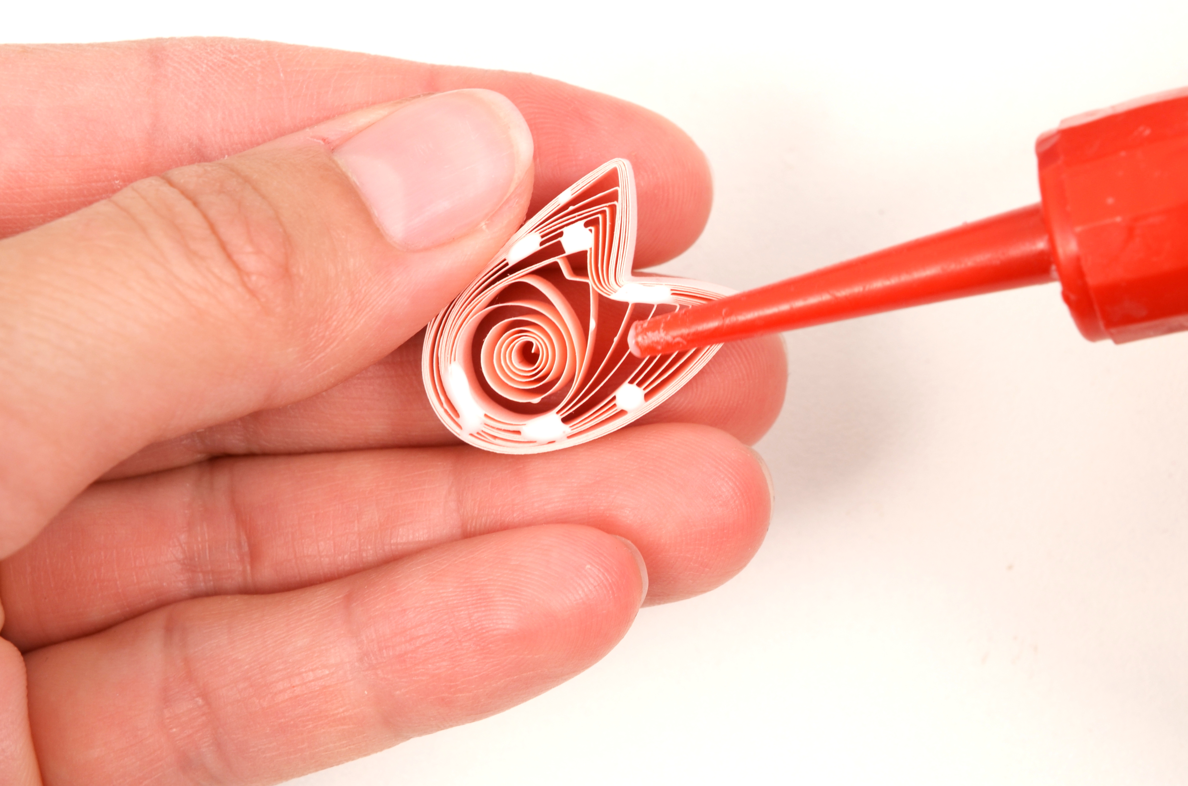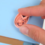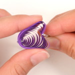 Konec volné spirálky přilepte, aby se dál neroztáčela. Přichytťe pinetkou střed spirálky ke kraji. Pomocí další pinetky promáčkběte spirálku asi do jedné třetiny. Za pomocí prstů chvíli stiskněte vzniklé rožky tulipánu do špičky.