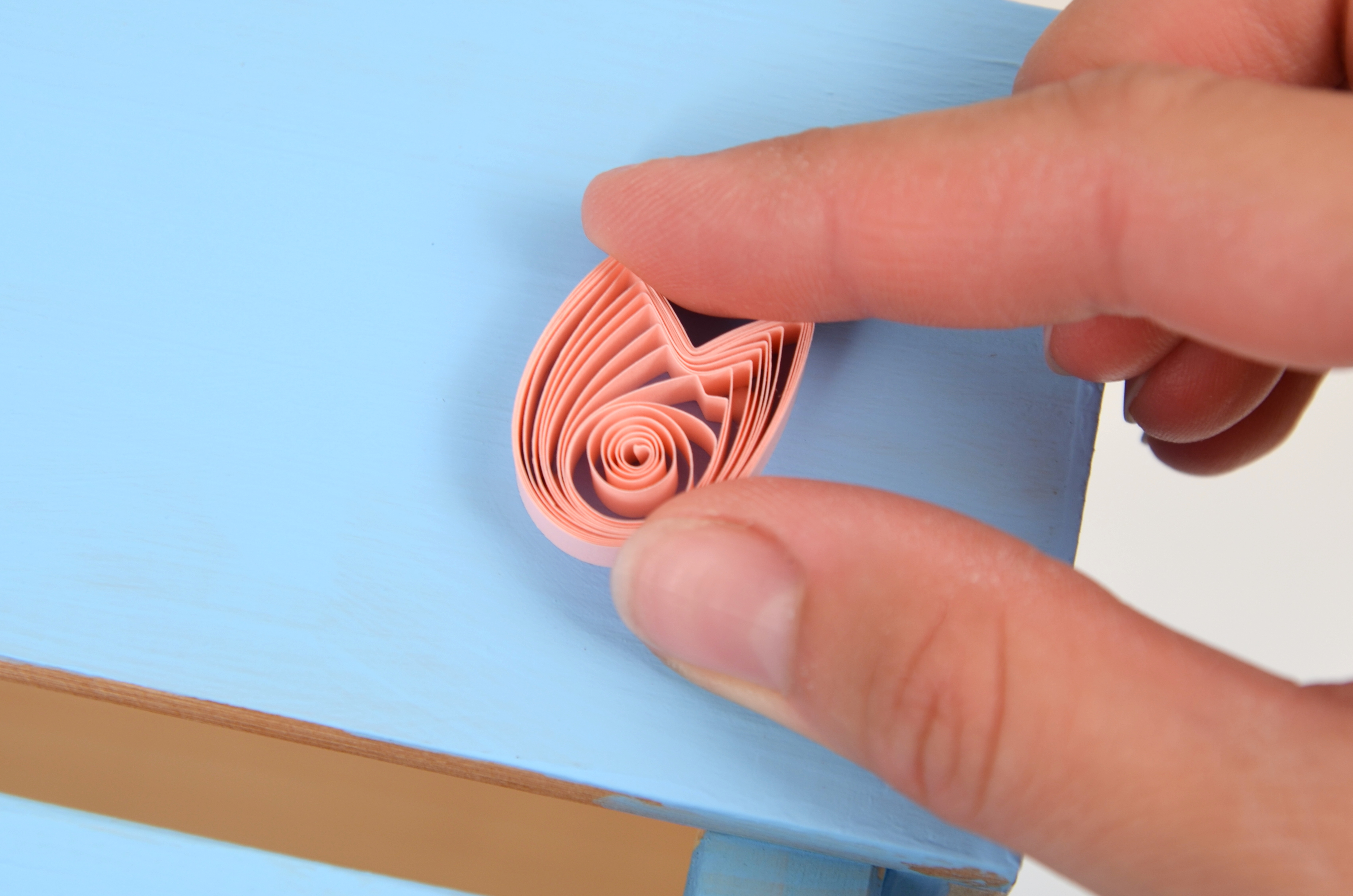 Nejdříve natřete bedýnku modrou barvou na dřevo a hned poté se pustťe do přípravy tulipánků. Každý tulipánek je ze dvou za sebe slepených quillingových proužků. Proužek namotejte na quillingové pero. Spirálku nechte rozvinout v prsech (nebo použijte kružnicovou šablonu) do velikosti asi 2 cm.