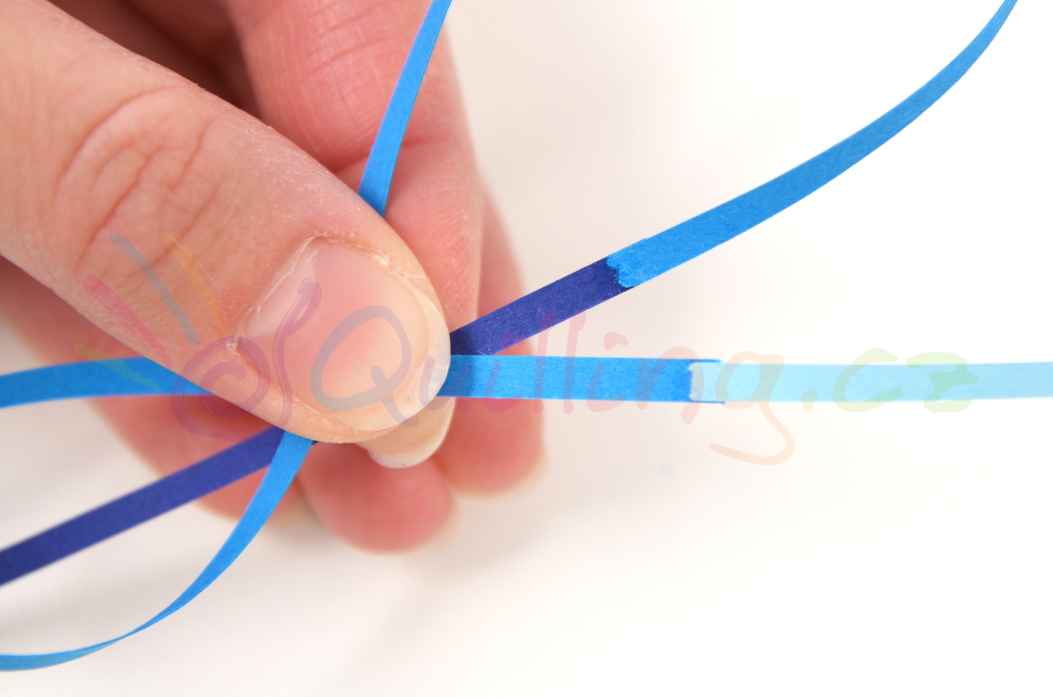 Spojte v jeden dlouhý proužek tyto tři proužky: světle modrý, modrý a tmavě modrý. Udělejte to ještě jednou, ať jsou barevné proužky dva, protože jedna náušnice je spojená ze dvou dílů. Obmotejte jeden spojovaný barevný proužek kolem pátého patra quillingové trojúhelníkové věže.