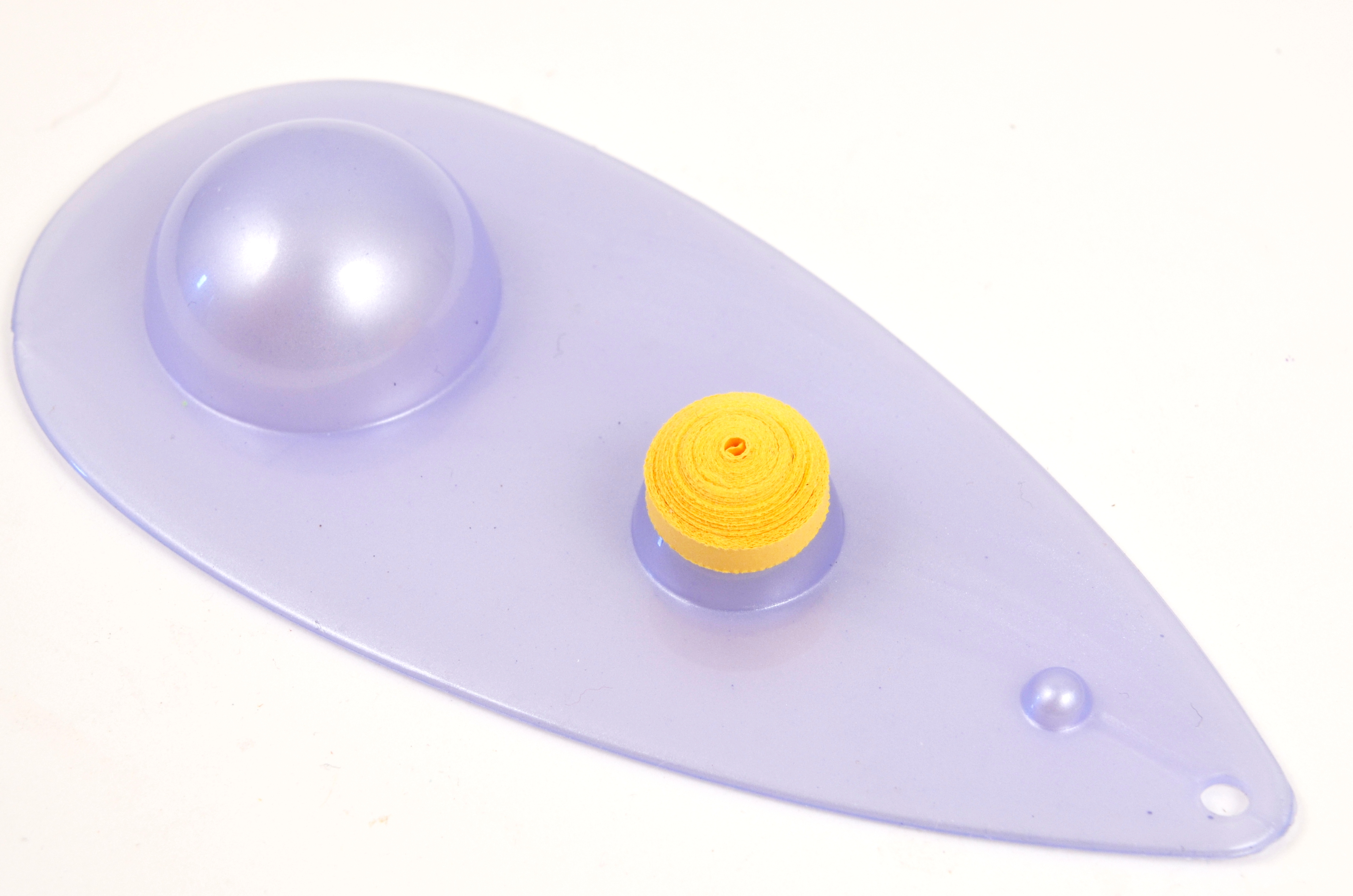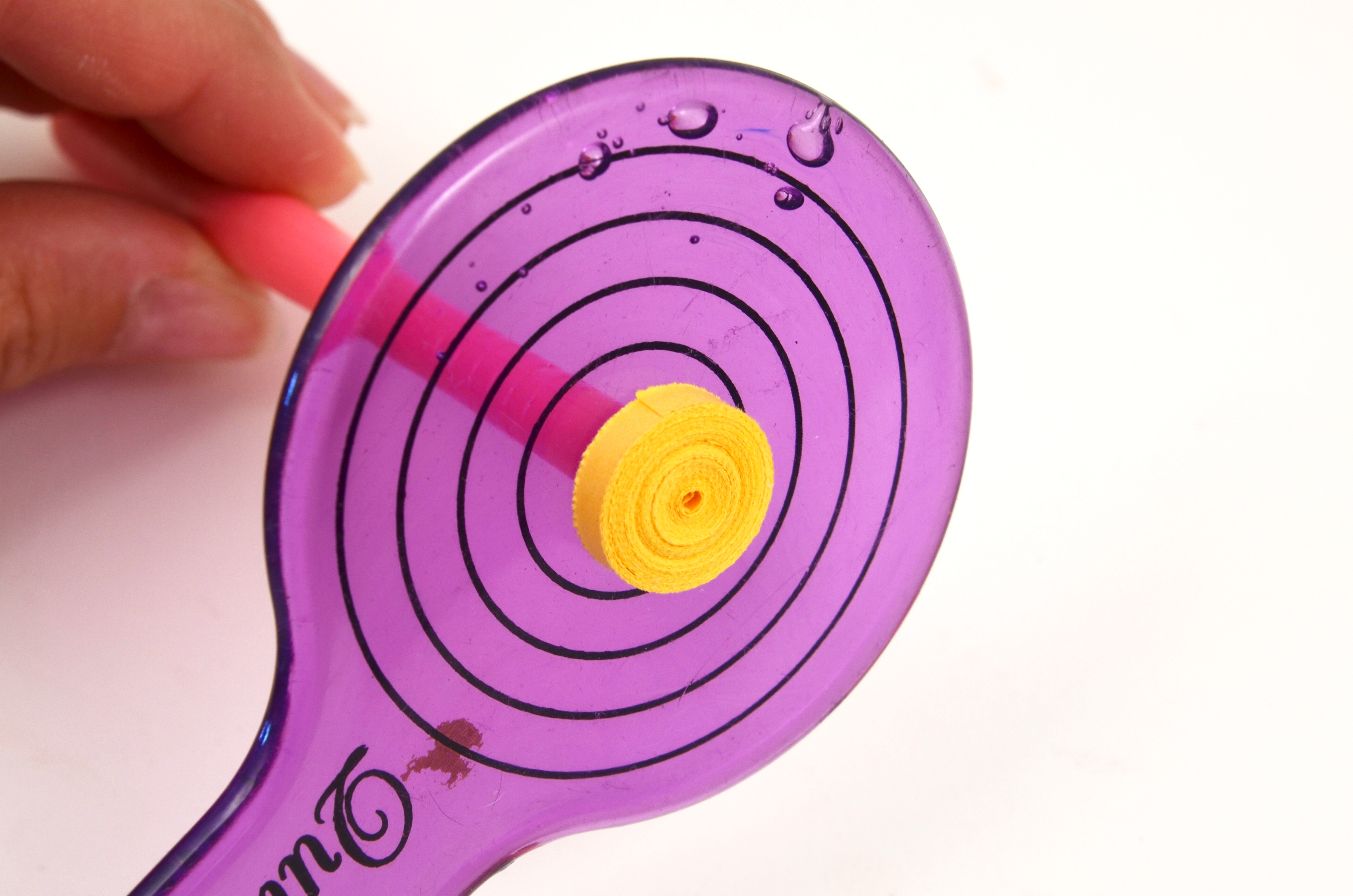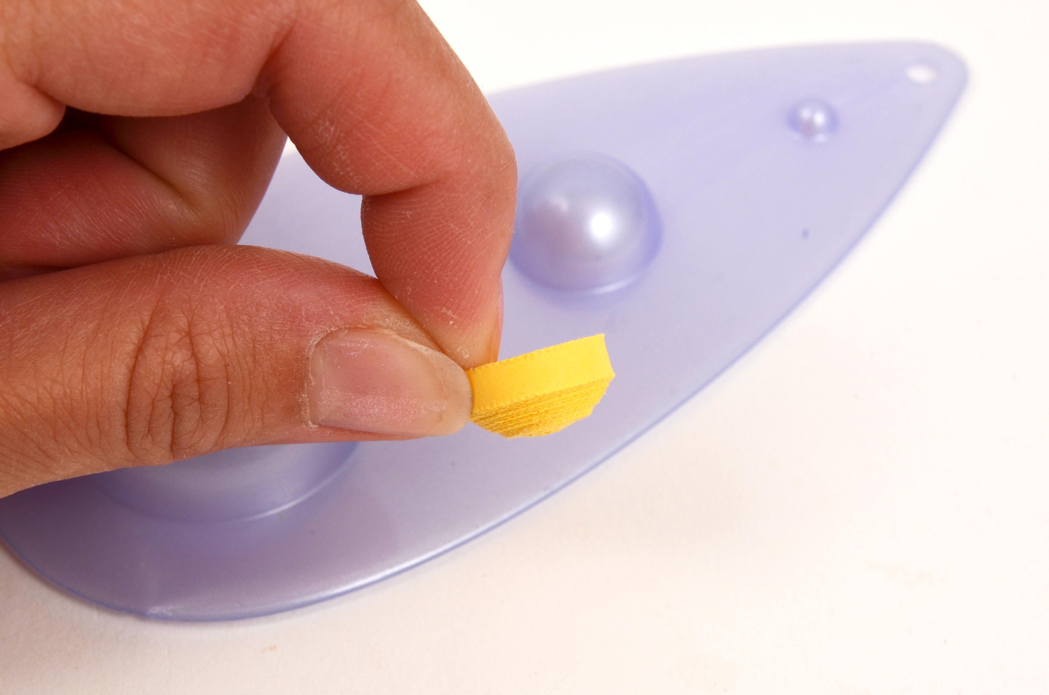 Nejdříve vytvořte tělíčko a hlavu v podobě placičky z proužků papíru. Tělíčko je umotané z pěti proužků slepených za sebe, hlavička ze tří proužků. Pro snadnou tvorbu placičky použijte quillingový navíječ (curling coach) nebo quillingové pero s talířkem. Placičku na tělíčko vjemně vytlačte do podoby mističky (můžete to udělat na bubilně pomůcky mini mold).