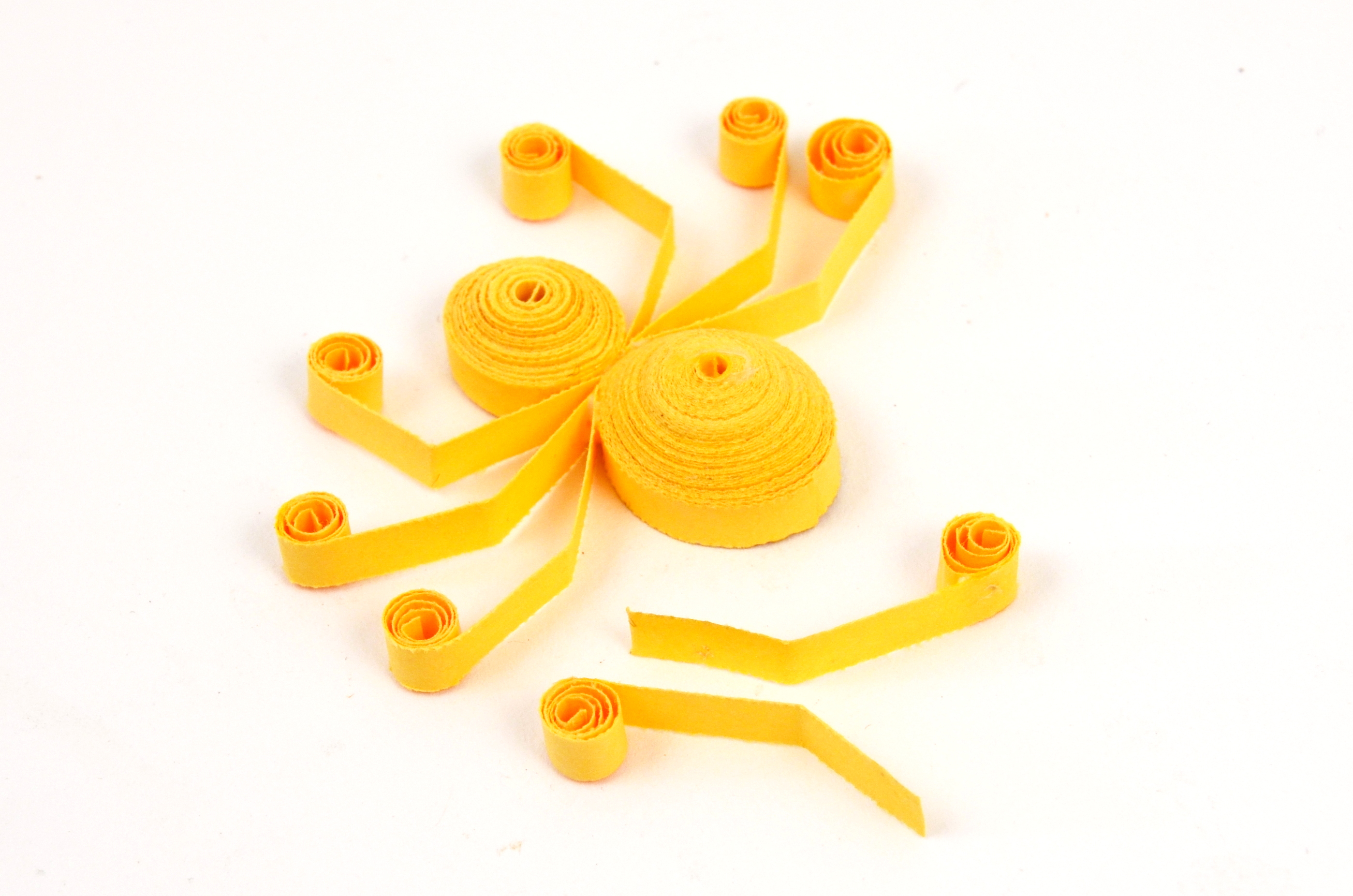 Slepte tělíčko a hlavičku k sobě a z krátkých proužků udělejte čtyři páry nožiček. Každá nožička je na konci jemně zakroucená.